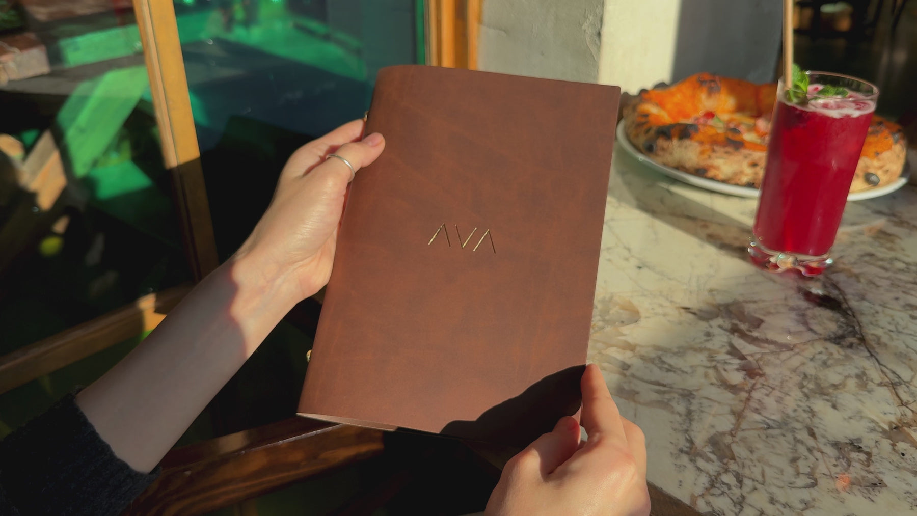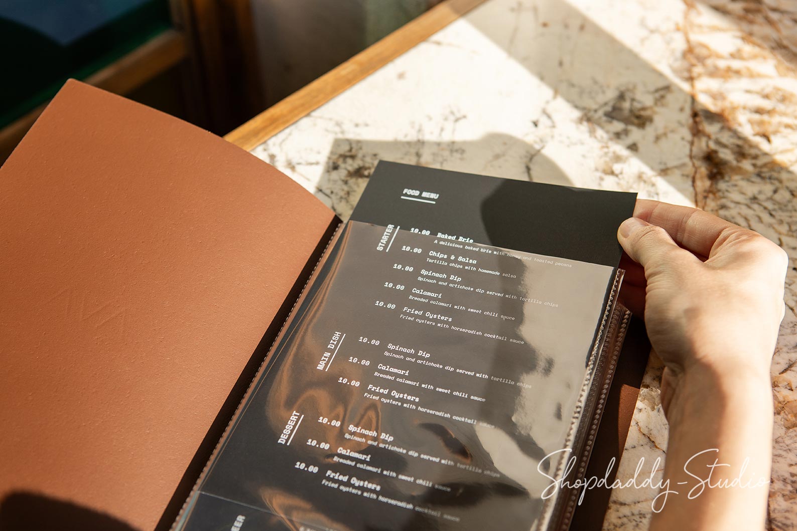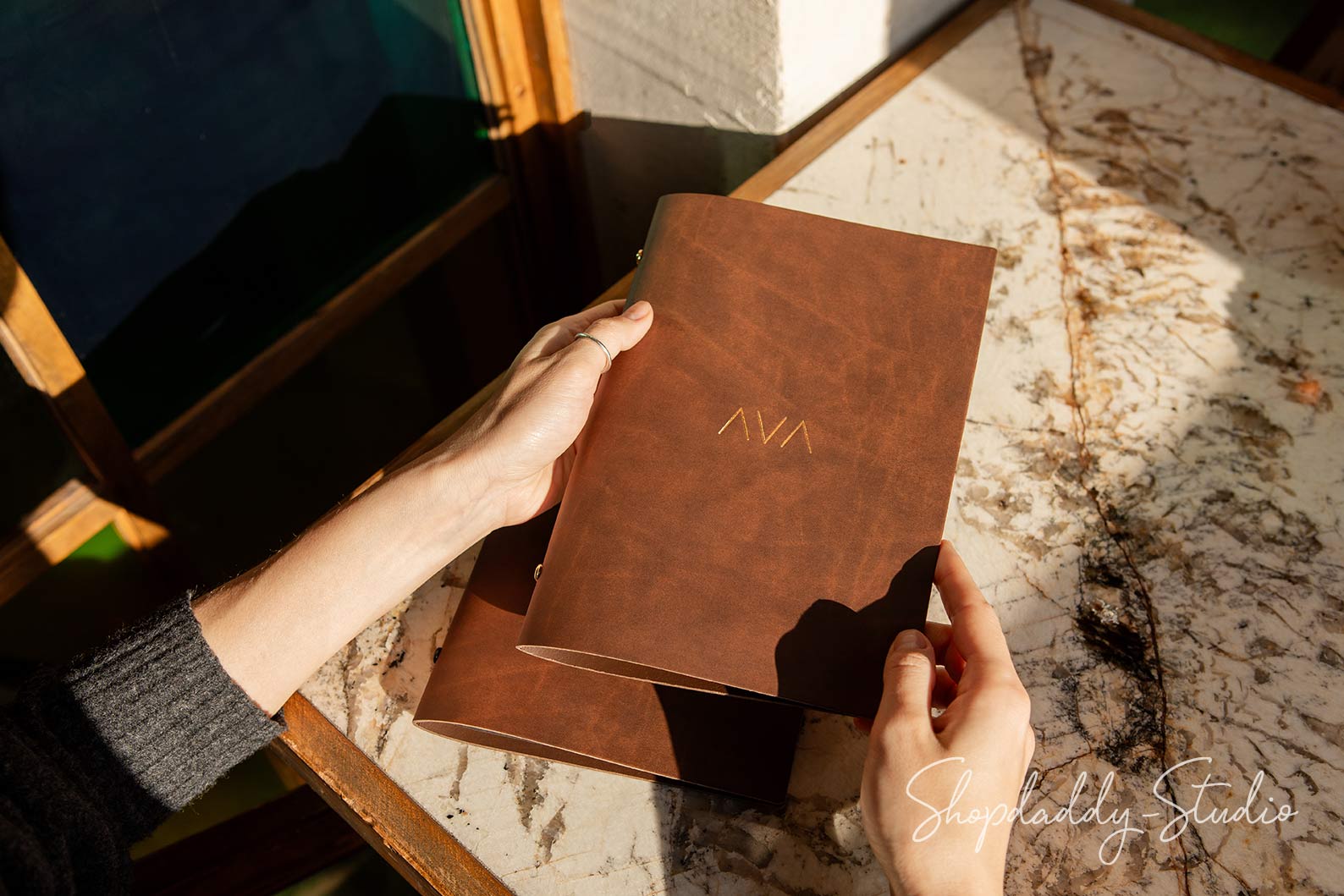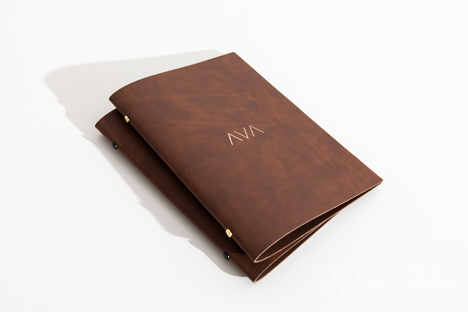 Elegante Menümappe aus recyceltem Leder, gefertigt für Restaurants, Bars und Cafés.