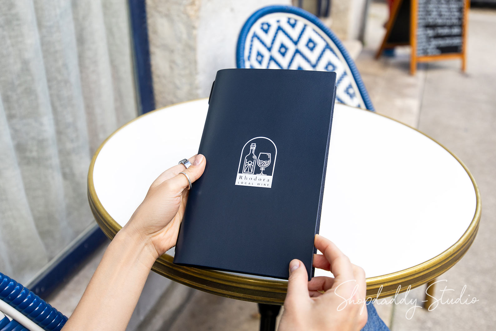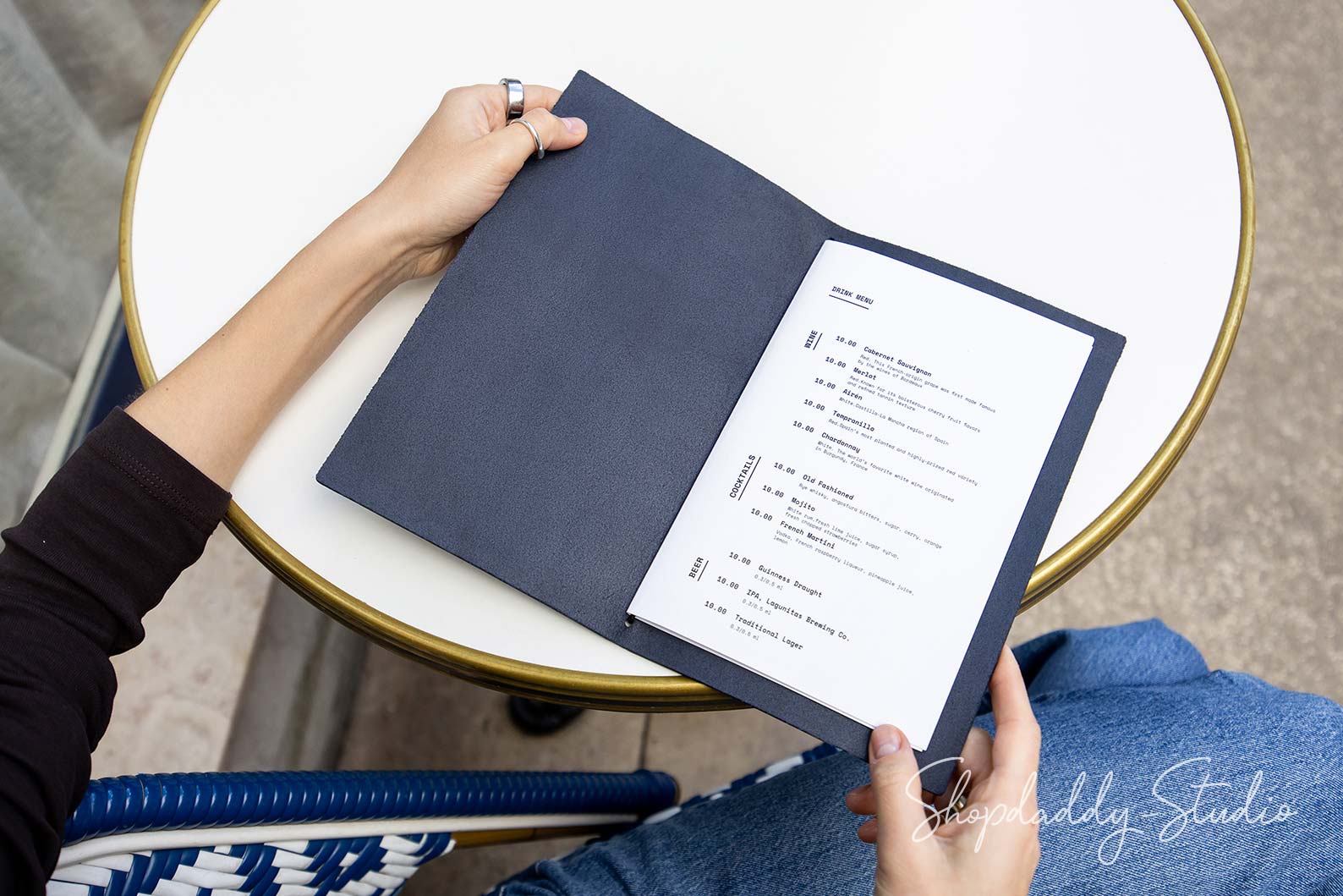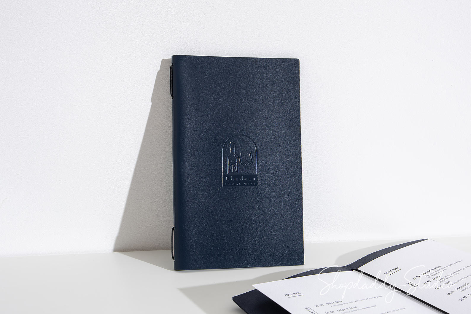 Unsere Premium-Leder-Menüabdeckungen sind aus dickem italienischem Leder gefertigt und bieten ein luxuriöses Aussehen und Langlebigkeit. Sie können sie mit Ihrem Logo durch Blind- oder Folienprägung personalisieren, und das Gummiband erleichtert das Austauschen der Menüs. Hinterlassen Sie mit diesem stilvollen Menübuch einen bleibenden Eindruck bei Ihren Kunden. Bitte beachten Sie, dass dieses Menümappendesign nur für in der Mitte gefaltetes Papier geeignet ist.