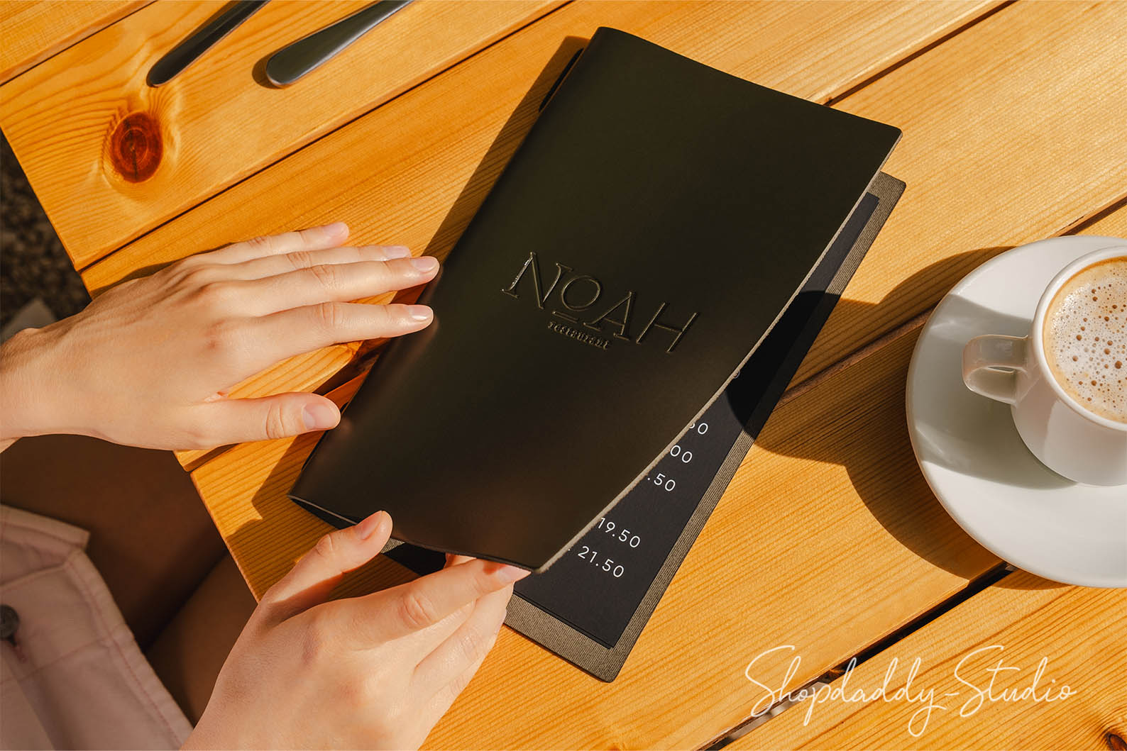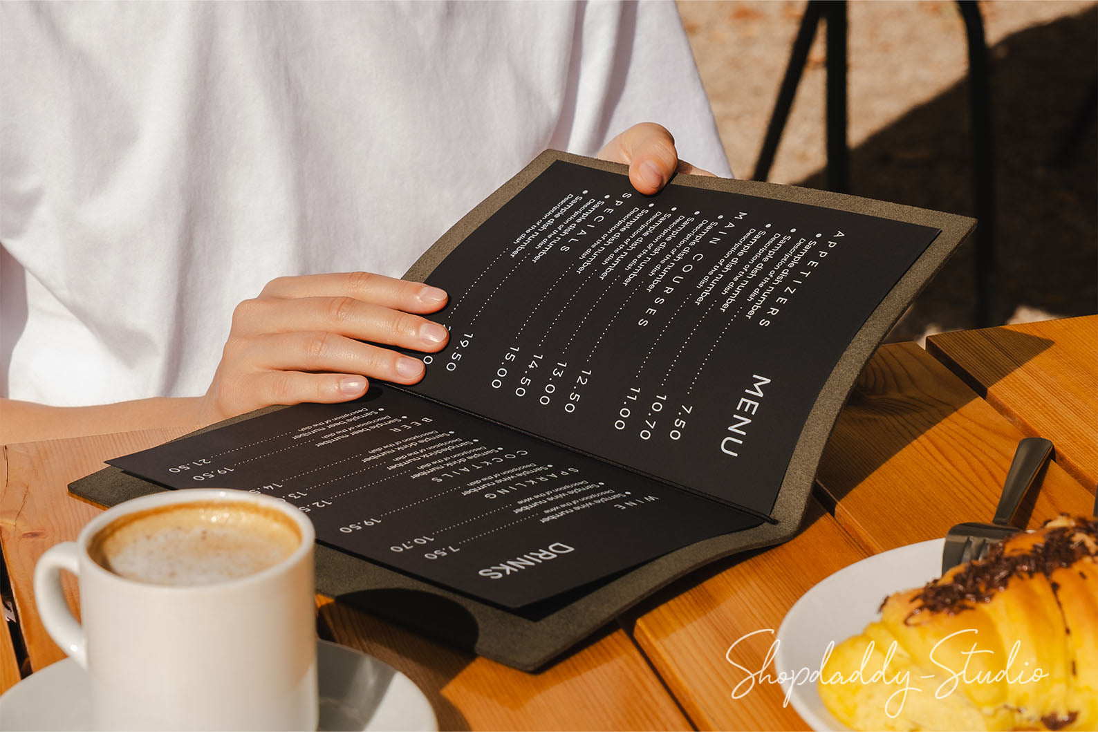 Normaler Preis €25,00 Sparen €-25,00Unsere Premium-Leder-Menüabdeckungen sind aus dickem italienischem Leder gefertigt und bieten ein luxuriöses Aussehen und Langlebigkeit. Sie können sie mit Ihrem Logo durch Blind- oder Folienprägung personalisieren, und das Gummiband erleichtert das Austauschen der Menüs. Hinterlassen Sie mit diesem stilvollen Menübuch einen bleibenden Eindruck bei Ihren Kunden. Bitte beachten Sie, dass dieses Menümappendesign nur für in der Mitte gefaltetes Papier geeignet ist.