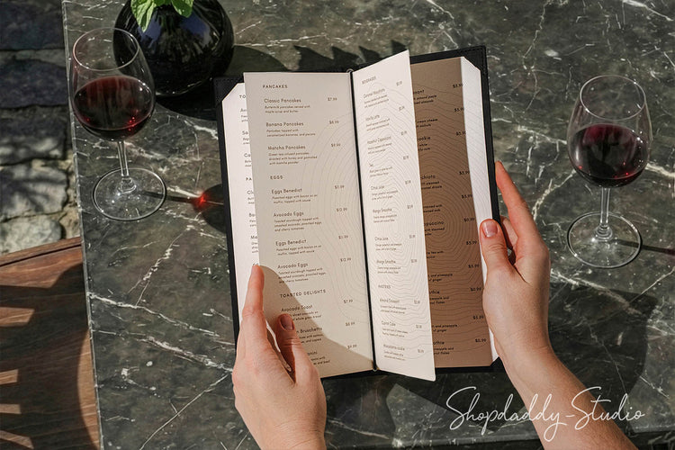 Leder-Menühülle aus hochwertigem doppellagigem Leder bietet Strapazierfähigkeit und eine stabile Struktur für den intensiven Einsatz in der Gastronomie. Mit Lederecken für ein einzelnes Menüblatt sowie einem Gummiband für zusätzlich in der Mitte gefaltete Seiten gestaltet, ermöglicht sie flexible Menüaktualisierungen bei gleichzeitig klarer und professioneller Präsentation.